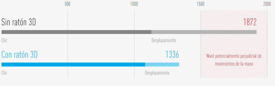 Con un ratón convencional siempre se utiliza el mismo dedo para hacer clic o accionar la rueda del ratón. Con un ratón 3D se realizan las tareas que previamente se llevaban a cabo con la mano dominante. La sobrecarga se distribuye entre ambas manos, en lugar de concentrarse en una de las dos. De este modo, el movimiento del dedo se reduce en un 28,6 %.