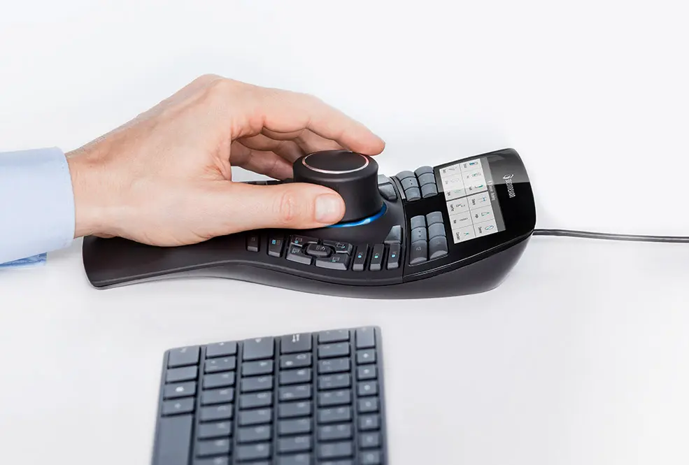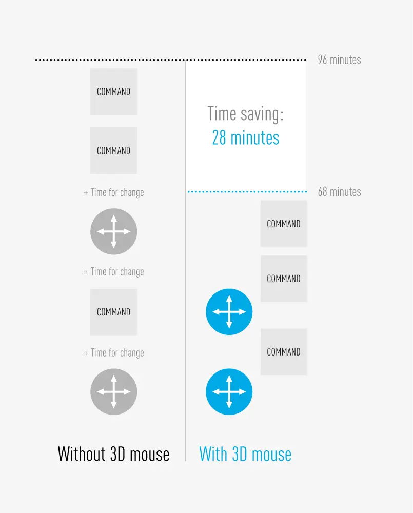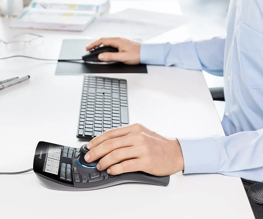 La sobrecarga excesiva en un lado del cuerpo es un síntoma que sufren muchos usuarios de CAD, que tensionan la musculatura del brazo y la mano a base de realizar movimientos repetitivos. Con un ratón 3D se reduce notablemente la necesidad de alternar entre el teclado y el ratón. Los accesos directos y las teclas reducen los movimientos del brazo y la mano, y aumentan el rendimiento del usuario hasta en un 28 %.* La forma de los botones hace que el uso del ratón sea muy intuitivo y reduce al mínimo la sobrecarga del dedo.