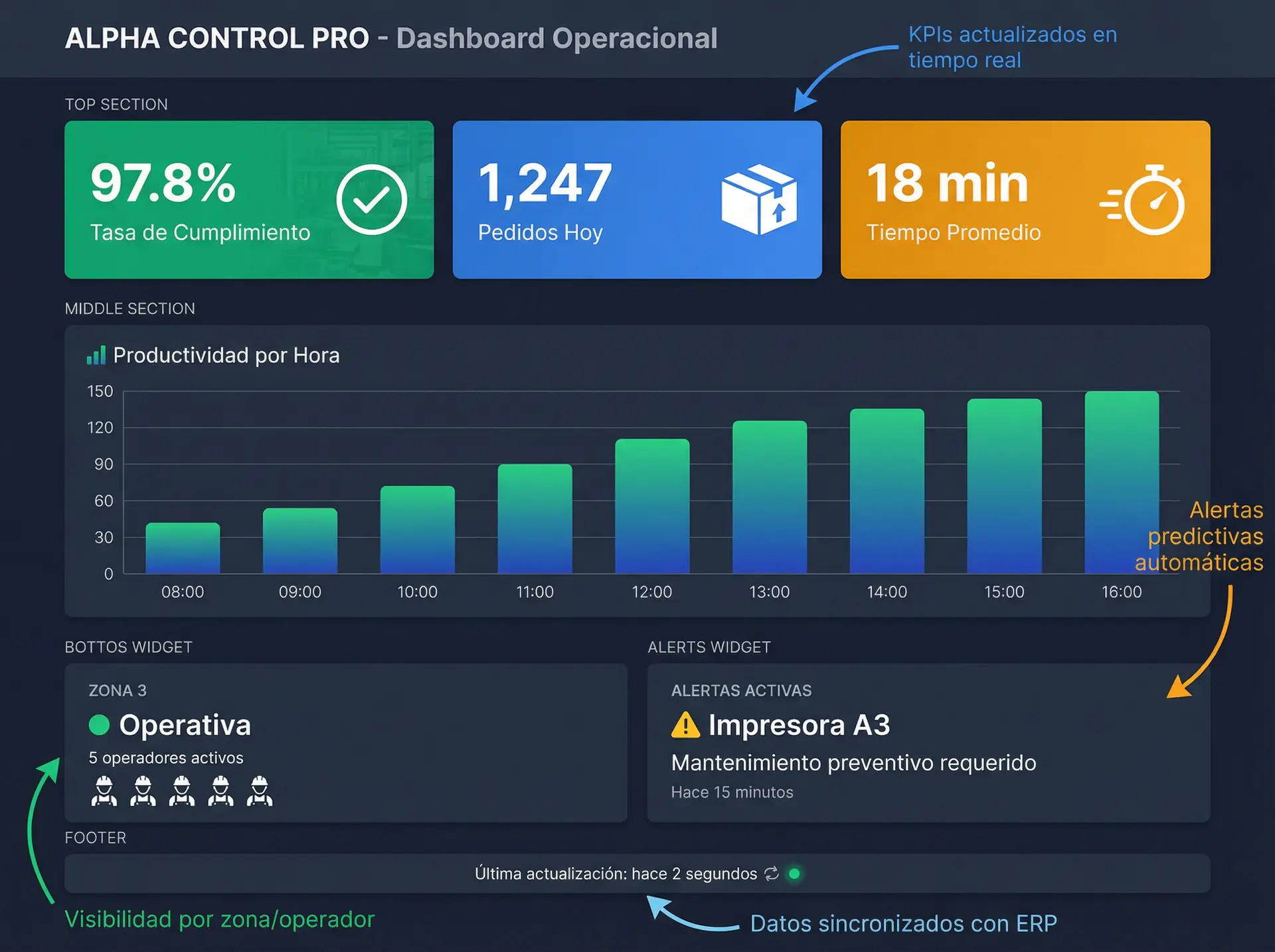 La mayoría de las empresas descubren los problemas cuando ya es tarde: inventario agotado, máquina detenida, pedido mal surtido. Operan con datos del día anterior, o de la semana pasada.
